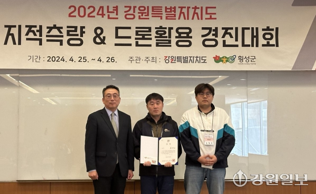 ◇화천군 김재한 부동산 담당(사진 가운데)과 김태호 개발행위 부서 주무관(사진 오른쪽)이 지난달 25일 횡성에서 열린 강원특별자치도 지적측량 및 드론활용 경진대회에서 드론활용 부문 대상을 차지했다.