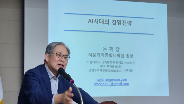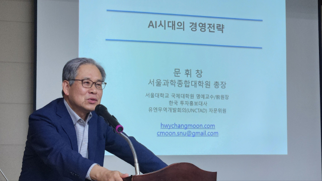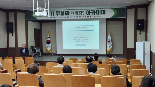 강원일보가 주최하고 율곡연구원이 주관하는 제4기 무실재 아카데미 제4주차 강의가 7일 율곡연구원 강당에서 열린 가운데 문휘창 서울과학종합대학원 총장이 'AI시대의 경영전략'을 주제로 강연했다.