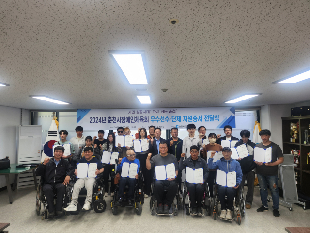 춘천시장애인체육회는 지난 10일 춘천시체육회 회의실에서 ‘2024년 우수선수 지원증서 전달식’을 열고 12개 종목(개인 10개 종목 20명, 단체 2개 종목) 장애인 선수들에게 증서를 전달했다. 이광호 상임부회장은 “앞으로 춘천시의 장애인 선수들을 위해 더욱 노력하고, 선수들이 더욱 쾌적한 환경에서 양질의 훈련을 할 수 있는 환경을 만들겠다”고 말했다.