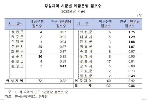 또 강원지역 예금은행의 인구 1만명당 점포 수는 0.86개로 전국 평균 1.06개 보다 적었다. 인구 1만명당 1개 이상의 점포가 있는 시군은 정선군(1.75개), 태백시(1.29개), 양양군(1.08개), 영월군(1.07개) 4곳이었고 횡성군(0.43개), 평창군(0.49개)은 0.5개 미만이었다.