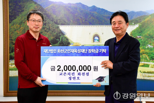 정연오 교촌치킨 화천점 대표는 26일 최문순 화천군 인재육성재단 이사장을 방문해 장학금 200만원을 기탁했다.