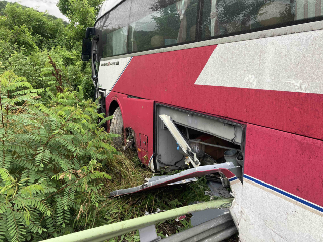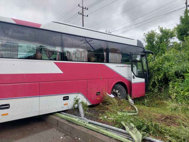 같은 날 오전 8시께 횡성군 둔내면 현천리 영동고속도로 서울 방향 도로에서 빗길에 미끄러진 승용차가 버스를 들이받았다. 사고의 충격으로 버스가 중앙분리대와 가드레일에 수차례 충돌한 뒤 도로 밖으로 이탈했다. 이 사고로 버스 운전자 B(61)씨가 크게 다치고 탑승객 4명이 가벼운 부상을 입었다.