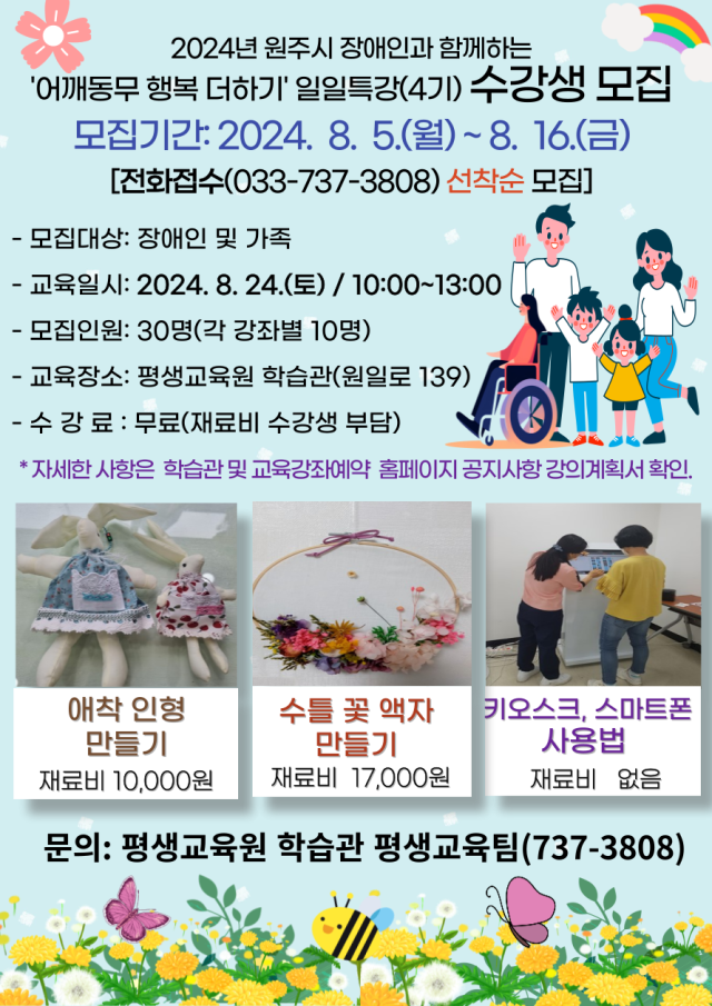 【원주】원주시 평생교육원 학습관은 5일부터 16일까지 장애인과 가족을 대상으로 어깨동무 행복 더하기’ 일일특강 4기 수강생을 모집한다.