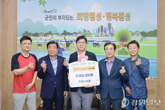 (주)유니모토 황문성 대표 일행이 지난 14일 횡성군청을 방문해 ‘횡성사랑 십시일반운동’ 성금 300만원을 전달하고 불우이웃을 돕기 위한 활동에 대해 의견을 나눴다.