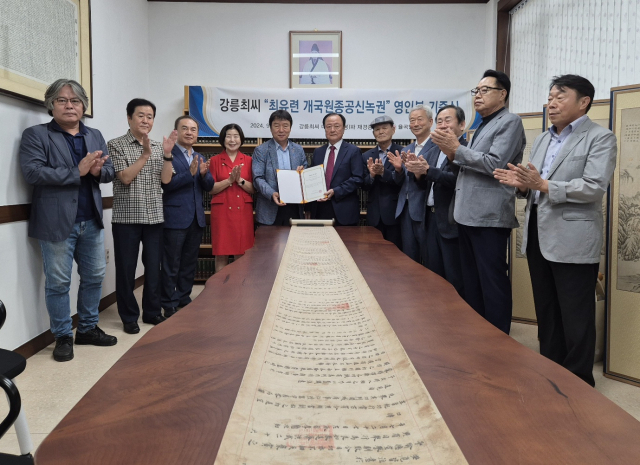 율곡연구원(원장:박원재)은 2일 연구원 회의실에서 강릉최씨 대경공(흔봉)파 재경종친회 최은철 회장을 비롯한 종인들이 참석한 가운데 보물 제1282호 ‘최유련 개국원종공신녹권(崔有漣 開國原從功臣錄券)’ 영인본 기증식을 개최했다.