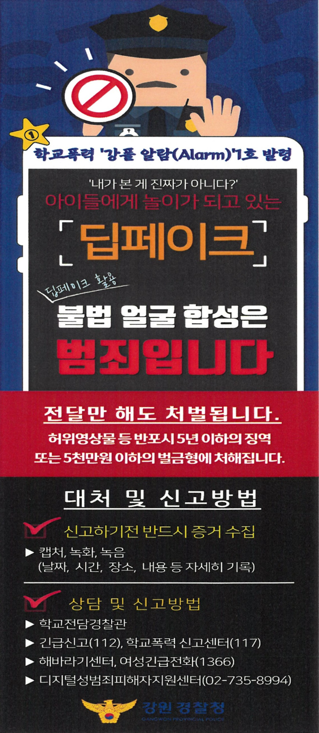 강원특별자치도학교밖청소년지원센터·청소년상담복지센터(센터장:장동현)는 4일 센터에서 강원경찰청(청장:엄성규)과 청소년 딥페이크 간담회를 개최했다. 참여 기관들은 이날 강원지역 청소년 딥페이크 범죄 예방활동 및 피해자 지원 방안을 논의했다. 각 기관은 청소년 예방 교육 및 센터 실무자 교육, 디지털 성범죄 피해자 상담 등에 대한 협력을 이어갈 예정이다.