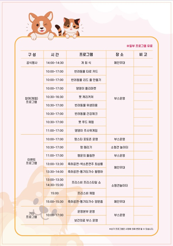 이날 반려동물 정책 홍보, 프리스비 프리스타일 쇼, 반려동물 건강체크, 반려동물 캐리커쳐, 댕댕이 플리마켓, 펫푸드쿠킹클래스, 댕댕이 주사위 게임, 멍때리기 이벤트 등 다양한 행사가 진행된다.