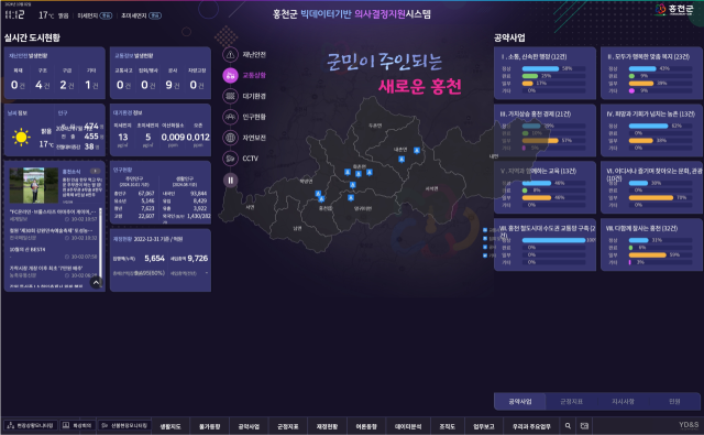 9일 군에 따르면 빅데이터 기반 의사결정지원시스템은 지능형 플랫폼인 그립(GRIP) 기반으로 하며, 대형 디지털 현황판을 통해 군정 지표, 사업 현황, 재정, 민원, 재난, 환경, 물가 정보 등을 한눈에 볼 수 있다. 강원특별자치도 내 시·군 지자체 중 이 시스템이 도입된 것은 홍천이 처음이다.