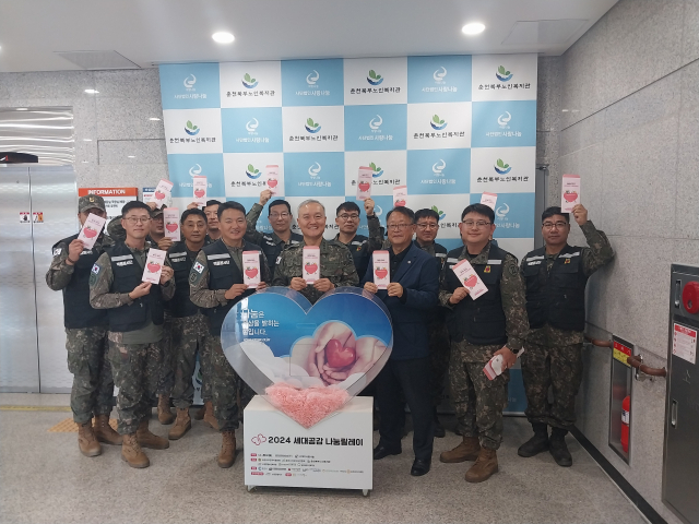 강원일보 등이 주최하는 ‘2024 세대공감 나눔릴레이 캠페인’의 제2공병여단 백룡봉사단 모금 전달식이 지난 11일 춘천북부노인복지관에서 열렸다.