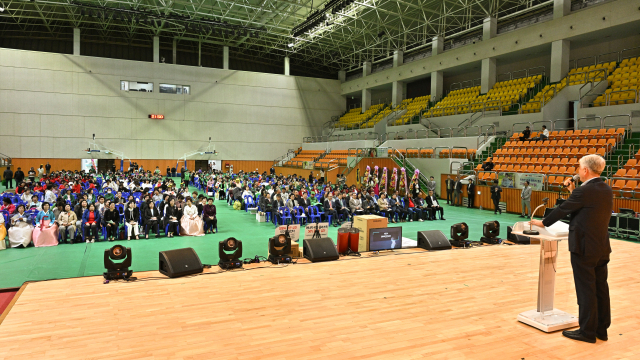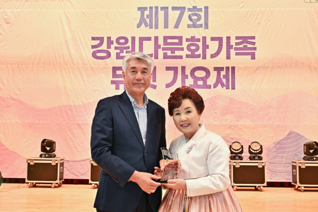 강원특별자치도 새마을부녀회(회장:전미용)가 주관하는 ‘제17회 강원다문화가족 듀엣가요제’가 15일 정선종합경기장 실내체육관에서 최승준 정선군수를 비롯한 전영기 정선군의장 등 기관단체장과 새마을부녀회원 등 800여 명이 참석해 열린 가운데 전미용 강원특별자치도 새마을부녀회장이 최승준 정선군수에게 감사패를 전달하고 있다.