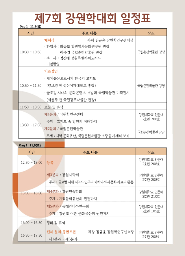 강원역사문화연구원 강원학연구센터(센터장:김규운)는 국립춘천박물관과 함께 8일부터 9일까지 1박2일 일정으로 제7회 강원학대회를 개최한다.