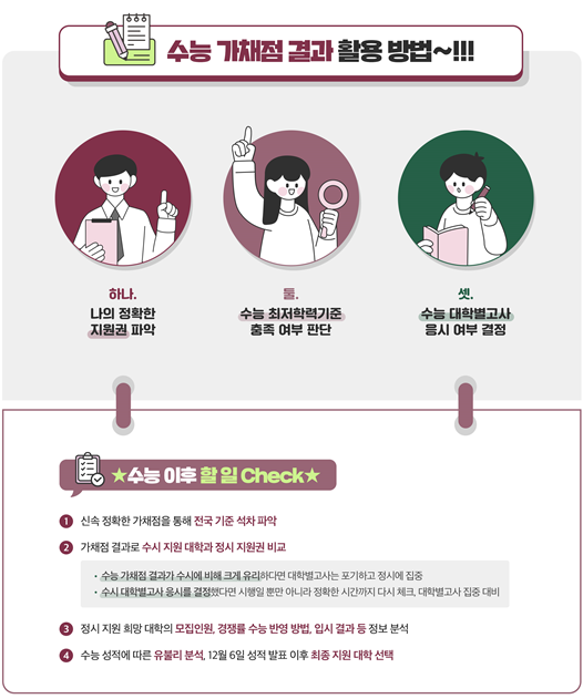14일 유웨이 교육평가연구소에 따르면 수능 직후 가채점 결과를 통해 우선 수시 지원 대학의 수능 최저학력기준을 충족했는지를 파악하고, 수시 지원 대학과 정시 지원 가능 대학의 합격 가능성을 비교․분석하는 것이 중요하다.