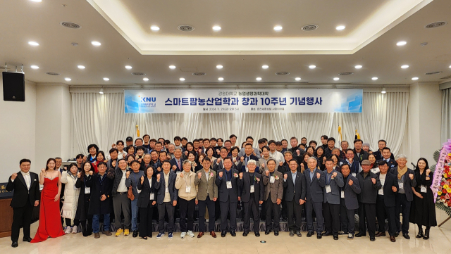 강원대 농업생명과학대학 스마트팜농산업학과(학과장:최기영)가 주최한 ‘스마트팜농산업학과 창과 10주년 기념행사’가 지난달 29일 춘천 세종호텔에서 열려 학과 졸업동문회에서 1,000만 원의 대학발전기금과 감사패를 전달했다.