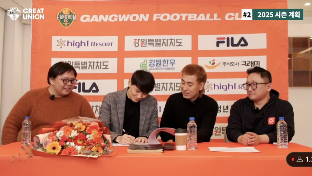 이날 직접 방송에 출연해 감독 계약서에 서명한 정경호 감독은 “강원FC는 나에게 의미가 큰 고향팀이고 감독을 맡게 돼 영광이다. 중책을 맡겨주신 김병지 대표님에게 감사드린다”며 “팬 여러분들에게 걱정 끼쳐 드리지 않도록 선수들과 함께 잘 준비하겠다. 2025시즌에도 팬들에게 행복을 드릴 수 있도록 노력하겠다. 그라운드에서 좋은 축구로 성원에 보답하겠다”고 소감을 밝혔다.
