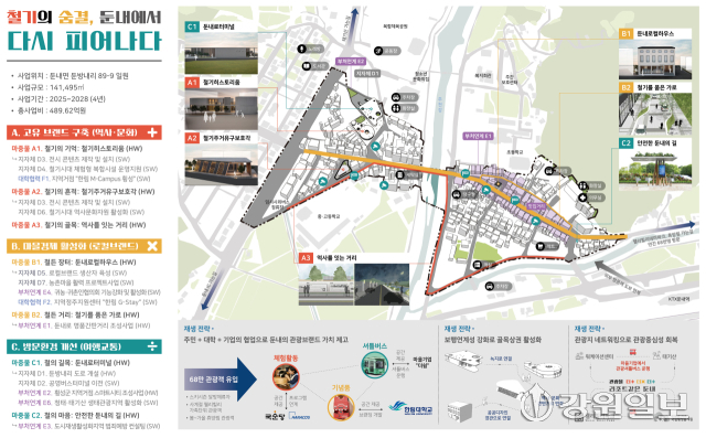 ‘지역특화’ 부문에 선정된 둔내 둔방내리는 14만㎡ 부지에 2028년까지 4년간 국비 150억원, 지방비 100억원 등 모두 250억원을 투입해 체류형 관광지로 꾸며진다. 희소 자원인 철기시대를 주제로 지역 고유의 정체성을 확립하는 이번 도시재생은 브랜드 구축, 마을경제 활성화, 방문환경 개선 등 7개 단위 사업이 추진된다.