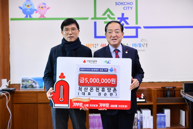 척산온천휴양촌(대표:권순완)은 9일 속초시청을 방문, 속초시 이웃연대 희망나눔기금으로 적립될 성금 500만원을 기탁했다.