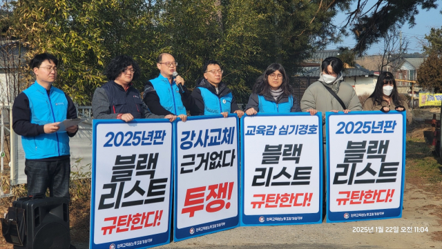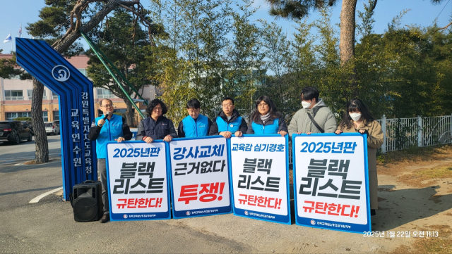 전국교직원노동조합 강원지부(지부장:최고봉)는 22일 강원특별자치도교육청교육연수원 별관 정문 앞에서 ‘2025년판 블랙리스트, 노조 탄압하는 부당한 강사 교체 요구 규탄’이라는 제목의 성명을 발표했다.