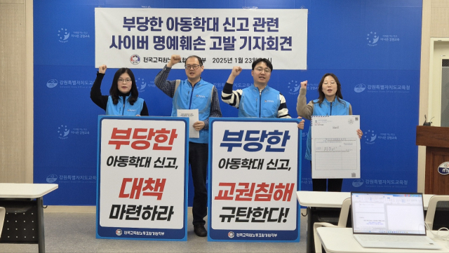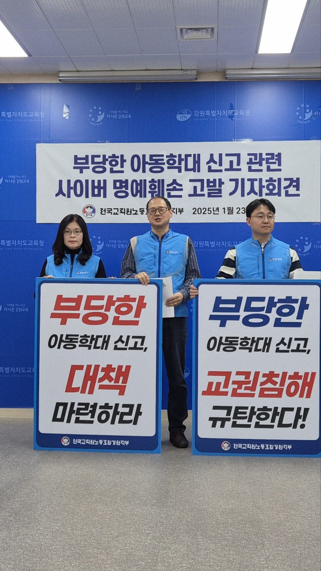 강원지부는 23일 강원특별자치도교육청 1층 브리핑실에서 ‘부당한 아동학대 신고 관련 사이버 명예훼손 고발 기자회견’을 열고 해당 사건의 경과와 대응 방침을 밝혔다.