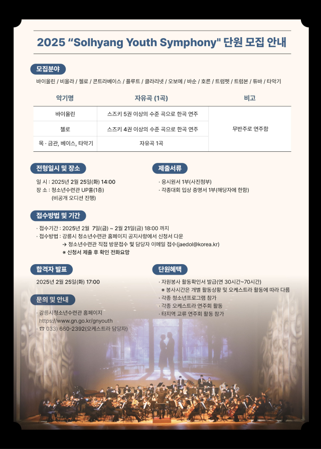 【강릉】강릉시 청소년수련관은 7일부터 2025년 강릉시 청소년오케스트라 솔향유스심포니 활동에 참여할 신규 단원을 모집한다.