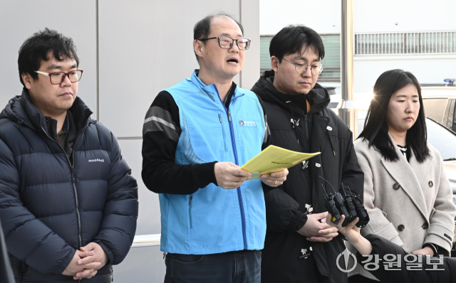 11일 춘천지법에서 최고봉 전국교직원노동조합 강원지부장이 체험학습 사고 인솔 교사에게 유죄를 판결한 재판부에 대해 유감을 표명하고 있다.