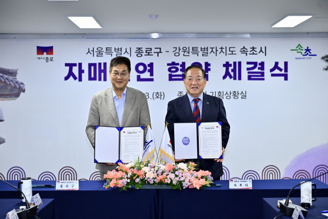 강원특별자치도 속초시(시장:이병선)와 서울특별시 종로구(구청장:정문헌)는 23일 종로구청 기획상황실에서 상생발전과 활발한 교류협력을 위한 친선결연식을 가졌다.