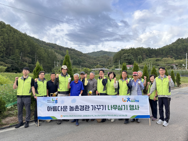 NH농협 춘천시지부(지부장: 전성열), 강원검사국(국장: 최상률), 농신보강원지역보증센터(센터장: 진경화), 남산농협(조합장: 한근수)은 24일 춘천시 남산면 산수리 마을에서 계통기관 임직원들과 함께 마을입구 도로변에 나무심기 및 농심천심 운동과 연계한 아름다운 농촌경관 가꾸기 캠페인을 벌였다.