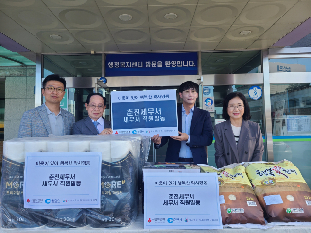 춘천세무서(서장:김현승) 직원들은 25일 추석을 맞아 취약계층을 돕기 위해 성금을 모아 격려금과 생필품을 약사명동행정복지센터에 전달했다.