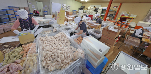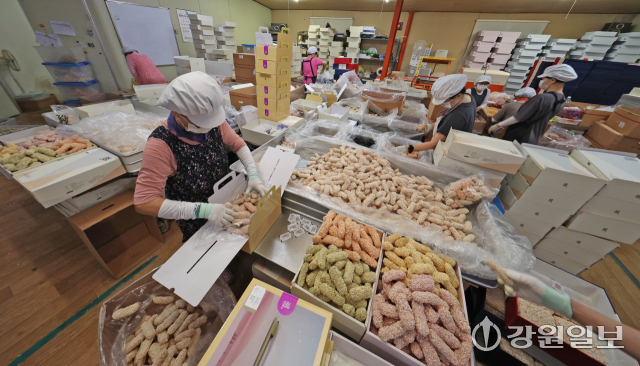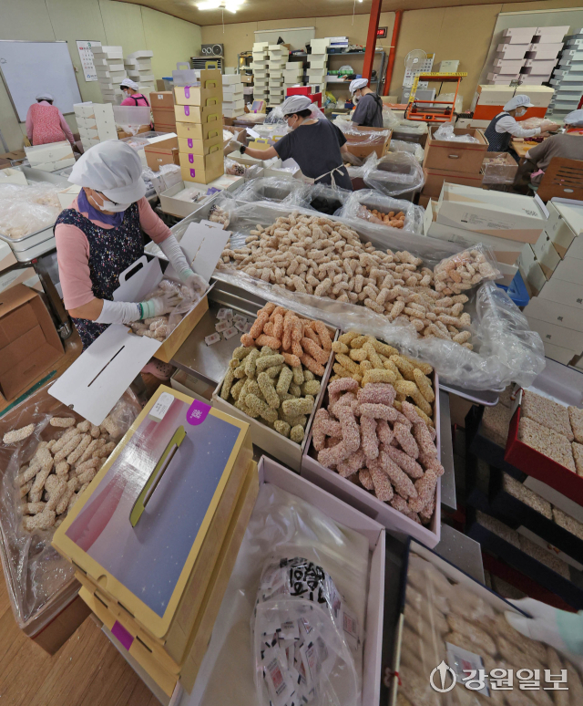 추석을 앞두고 지난 29일 강릉의 대표적 전통한과마을인 사천면 명일전통한과에서 직원들이 명절에 사용할 전통한과를 만드느라 분주하다. 강릉=권태명기자추석을 앞두고 지난 29일 강릉의 대표적 전통한과마을인 사천면 명일전통한과에서 직원들이 명절에 사용할 전통한과를 만드느라 분주하다. 강릉=권태명기자추석을 앞두고 지난 29일 강릉의 대표적 전통한과마을인 사천면 명일전통한과에서 직원들이 명절에 사용할 전통한과를 만드느라 분주하다. 강릉=권태명기자