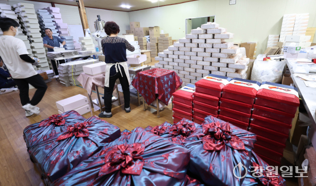 추석을 앞두고 지난 29일 강릉의 대표적 전통한과마을인 사천면 명일전통한과에서 직원들이 명절에 사용할 전통한과를 만드느라 분주하다. 강릉=권태명기자