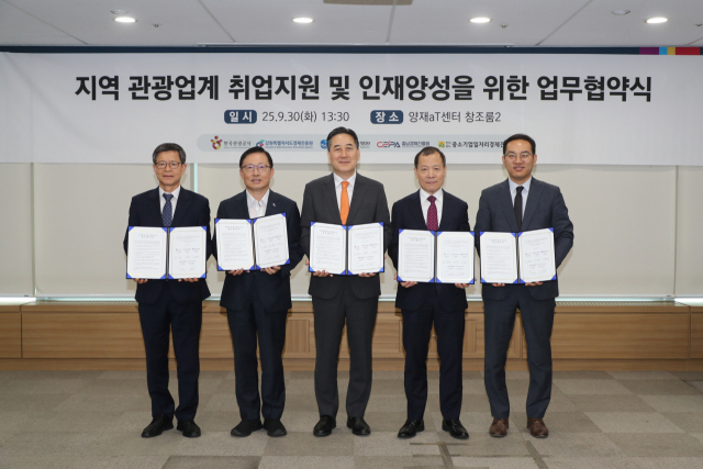관광공사와 도경제진흥원 등은 30일 서울 양재동 aT센터에서 지역 관광업계 취업지원·인재양성을 위한 업무협약을 했다. 이번 협약에는 충청북도기업진흥원, 충남경제진흥원, 전라남도중소기업일자리경제진흥원 등도 동참했다.