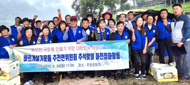 바르게살기운동 영월 주천면위원회(회장:김봉대)는 지난달 28일 추석을 맞아 주천강 둔치에서 선주헌 군의장 등이 참여한 가운데 하천 정화 활동을 진행했다.