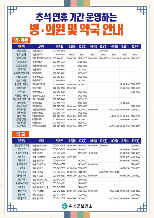 또 보건소 응급진료대책상황실을 통해 당번 의료기관·약국 민원 등을 안내하고 응급의료기관과 문 여는 병·의원, 약국 운영현황 등을 점검한다. 이와 함께 추석 당일인 6일에는 횡성군보건소에서 오전 9시부터 오후 6시까지 일반진료를 실시해 군민들의 의료서비스 불편을 최소화할 방침이다.