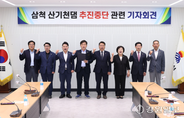 국민의힘 소속 권정복 삼척시의장과 시의원들, 조성운·심영곤 도의원은 1일 시청 회의실에서 긴급 기자회견을 열고, 산기천댐 백지화를 즉각 철회하고 다목적댐으로 건설해야 한다고 주장했다.