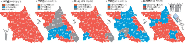 하지만 이번에는 더불어민주당 이재명 대통령 취임 이후 치러지는 선거다. 그래서 집권여당인 민주당이 유리할 것이라는 예상이 많다. 실제 2018년 제7회 지방선거가 그랬다. 당시 박근혜 대통령이 탄핵되면서 2017년 3월 민주당 문재인 대통령이 당선됐고, 그로부터 1년 후 치러진 2018년 6월 지선에서는 도지사와 18개 시·군중 11곳을 민주당이 가져갔다. 현재와 비슷한 상황이다.