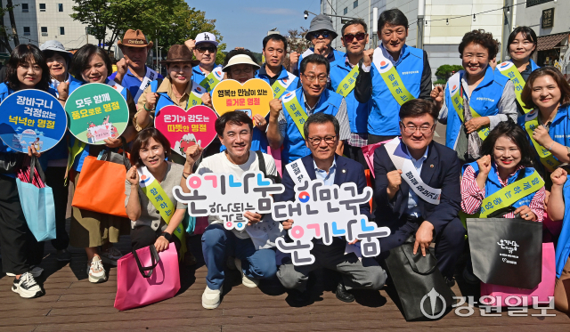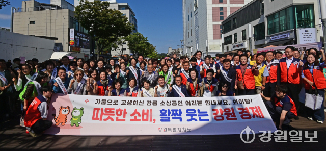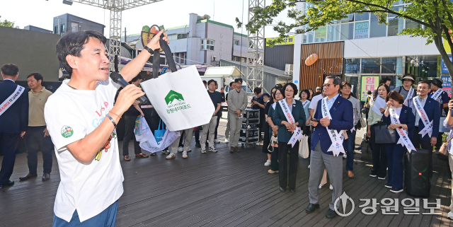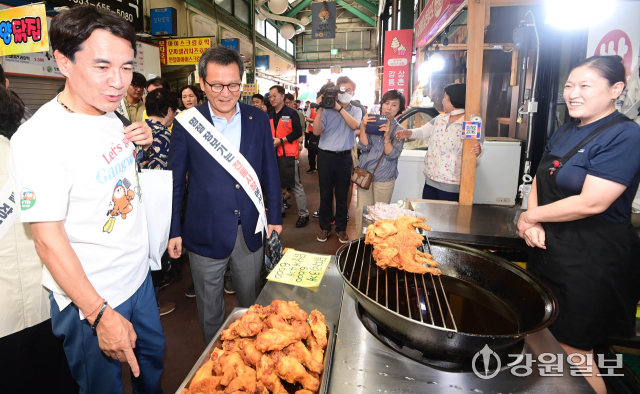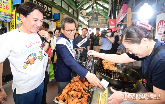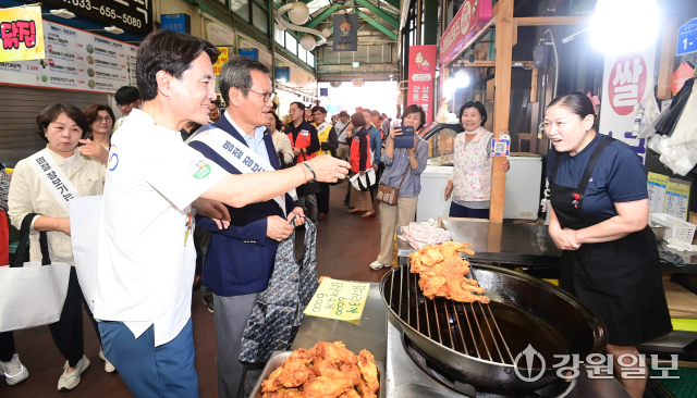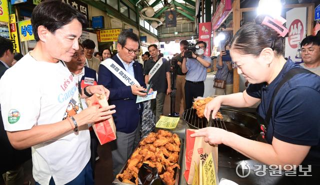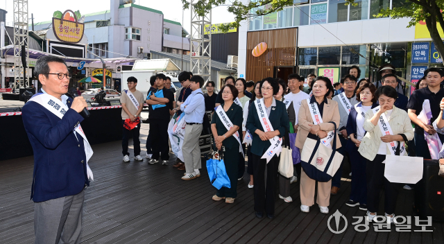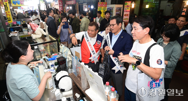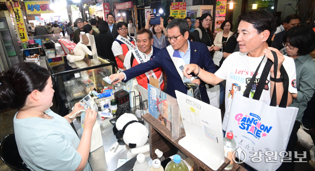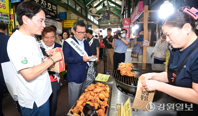 김진태 강원특별자치도지사와 김홍규 강릉시장이 1일 강릉 중앙시장에서 열린 추석맞이 소비촉진 캠페인 및 전통시장 합동 장보기 행사에서 도·시청 및 유관기관, 시민단체 회원 등과 함께 장을 보고 있다. 강릉=권태명기자