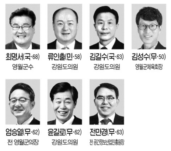 더불어민주당에서는 원주시의원 3선을 지낸 영월 출신 류인출 도의원이 거론된다. 강원특별자치도와 원주를 잇는 정치 경력을 앞세워 ‘영월의 새로운 목소리’를 낼 수 있을지 관심이다. 무소속의 윤길로 도의원과 엄승열 전 군의장은 각각 의정 경험과 지역조직 기반으로 이름이 오르내리고 있으며 민주당 입당 이야기도 흘러나오고 있다. 체육계의 지지를 받고 있는 김성수 군체육회장도 부상하고 있다. 여기에 영월 출신 전만경 전 공간정보산업진흥원장의 등장도 변수다.
