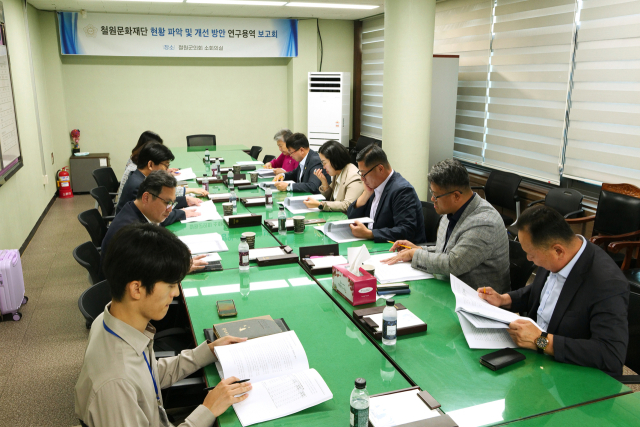 철원군의회(의장:한종문) 연구단체인 '철원문화재단 현황 파악 및 개선방안 연구회(이하 연구회)'는 2일 군의회 소회의실에서 '철원문화재단 현황 파악 및 개선 방안 연구 용역' 최종 보고회를 열었다. 연구회는 철원문화재단의 효율적이고 건전한 운영을 위해 운영 상황을 파악하고 개선방안을 제시하기 위해 올 5월 구성돼 연구용역 착수 및 철원문화재단 분석, 중간보고회 등을 진행해왔다. 이날 최종보고회에서는 연구회 참여 군의원을 비롯해 정창수 나라살림연구소장, 남승우 객원연구위원이 참석해 연구배경과 연구내용, 개선방안 등을 보고하는 등 연구용역을 마무리했다,
