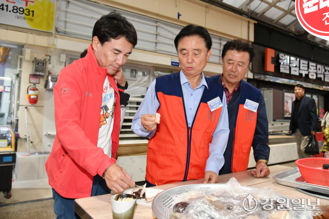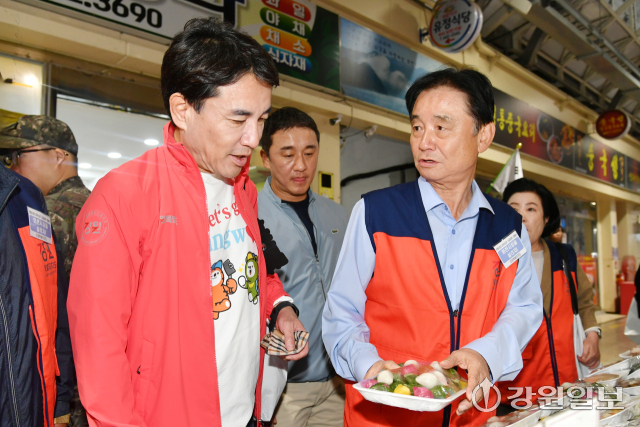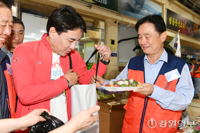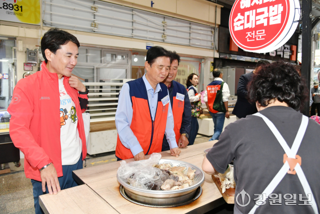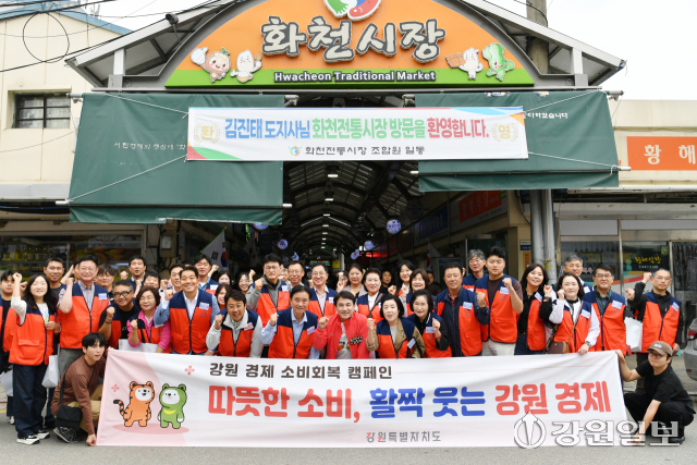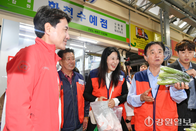 추석맞이 전통시장 장보기 행사가 지난 3일 화천 전통시장에서 김진태 강원특별자치도지사, 최문순 화천군수, 박대현 도의원, 김선미 강원여성경영인협회장, 황재득 강원청년소상공인협회장, 이화영 화천시장 조합장 등이 참석한 가운데 열렸다.