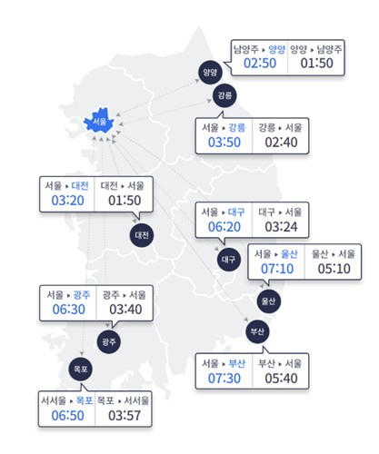서울에서 각 지역까지의 예상 소요 시간을 살펴보면 강릉 3시간 50분, 부산 7시간 30분, 울산 7시간 10분, 광주 6시간 30분, 대구 6시간 20분, 대전 3시간 20분으로 집계됐다. 반대로 각 도시에서 서울까지는 강릉 2시간 40분, 부산 5시간 40분, 울산 5시간 10분, 광주 3시간 40분, 대구 3시간 24분, 대전 1시간 50분이 걸릴 것으로 예상된다고 한국도로공사가 밝혔다.