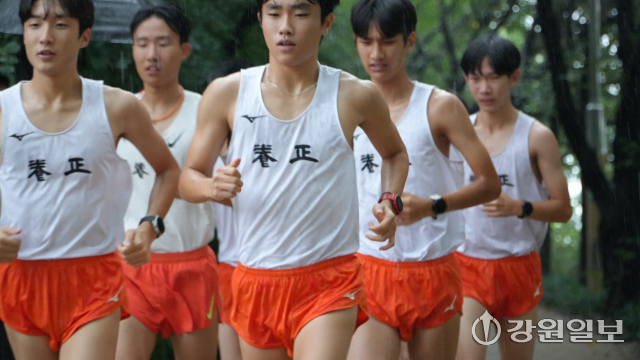 ◇비가 내리는 궂은 날씨 속에서도 구슬땀을 흘리며 달리는 양정고 육상부 선수들. 창단 당시의 전통 유니폼을 그대로 이어 입은 채, 선배들의 투혼과 정신을 계승하고 있다. 김태훈기자