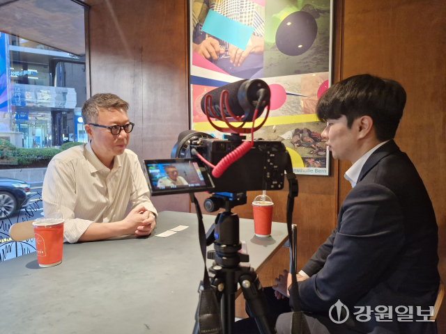 ◇강원일보 이동수 기자가 함기용 선수의 장남 함종규씨를 인터뷰 중이다. 김태훈기자