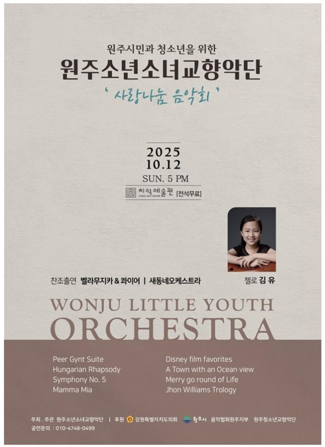 【원주】원주소년소녀교향악단은 12일 오후 5시 치악예술관에서 사랑 나눔 음악회를 한다.