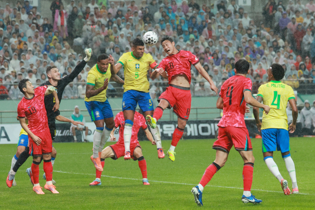 ◇10일 서울 마포구 서울월드컵경기장에서 열린 한국과 브라질 축구 대표팀의 친선경기. 백승호가 코너킥 상황에서 브라질 카제미루와 공중볼을 다투고 있다. 연합뉴스