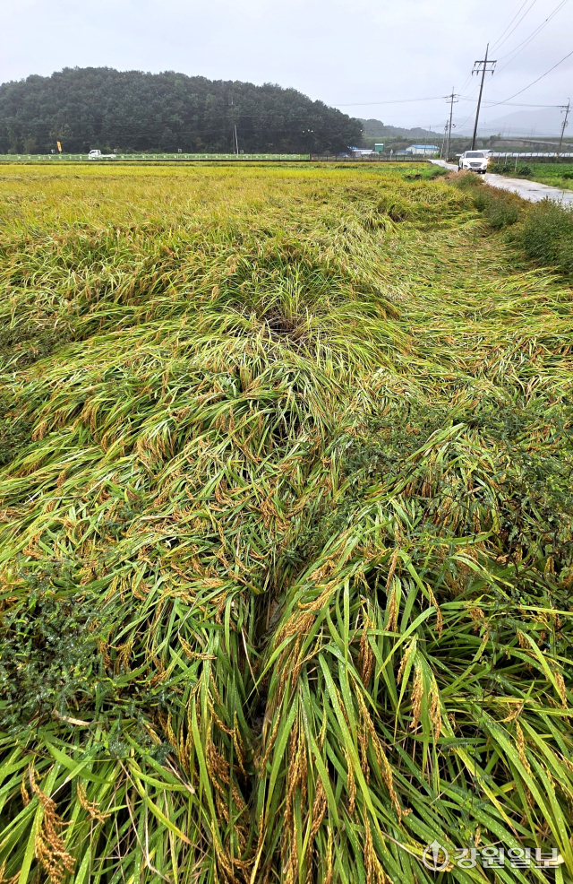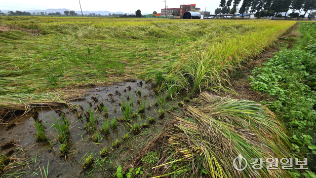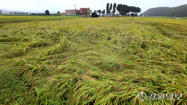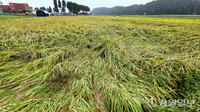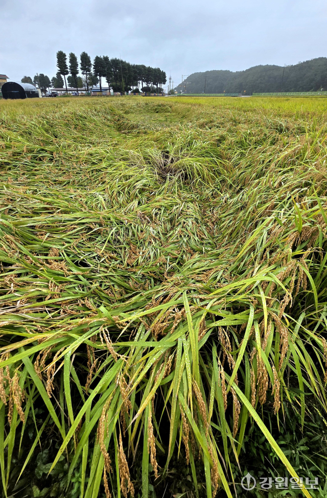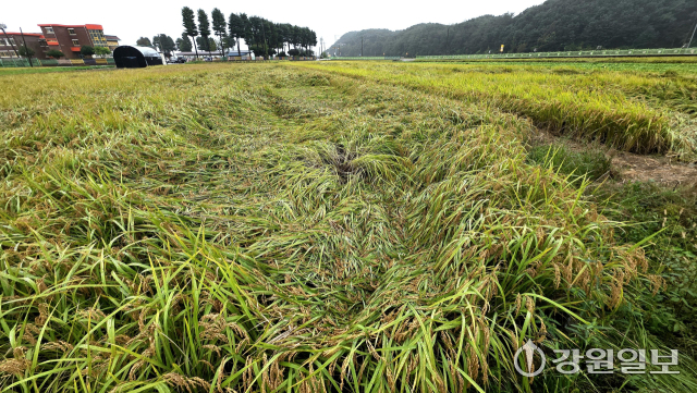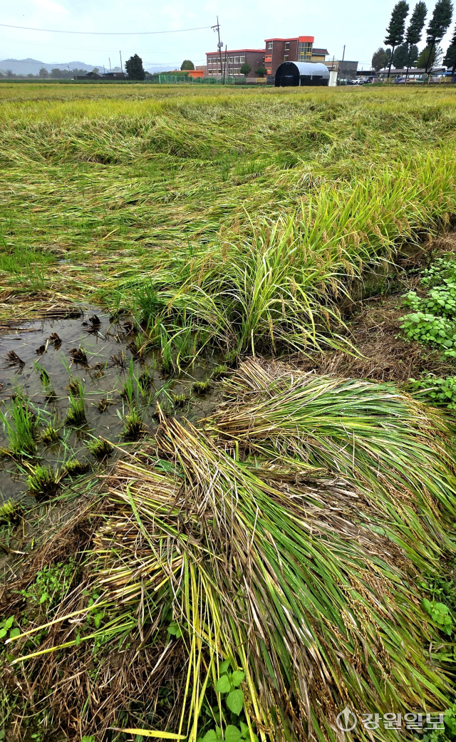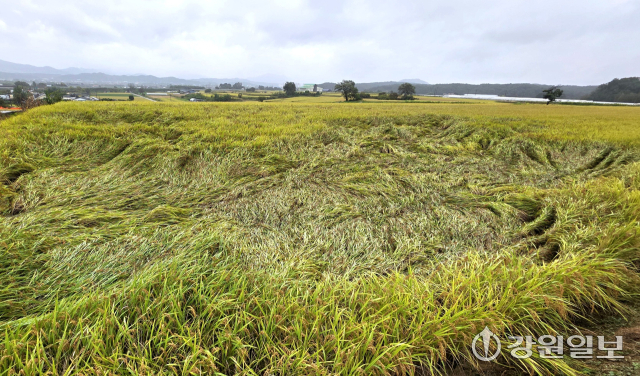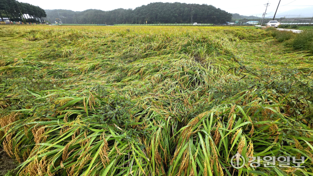 수확철을 앞둔 농촌지역에 이례적인 가을장마가 찾아오면서 수확에 차질을 빚을까 우려하는 농민들의 근심이 커지고 있다. 13일 춘천시 서면의 논에 누렇게 익은 벼가 폭우에 쓰러져 있다.