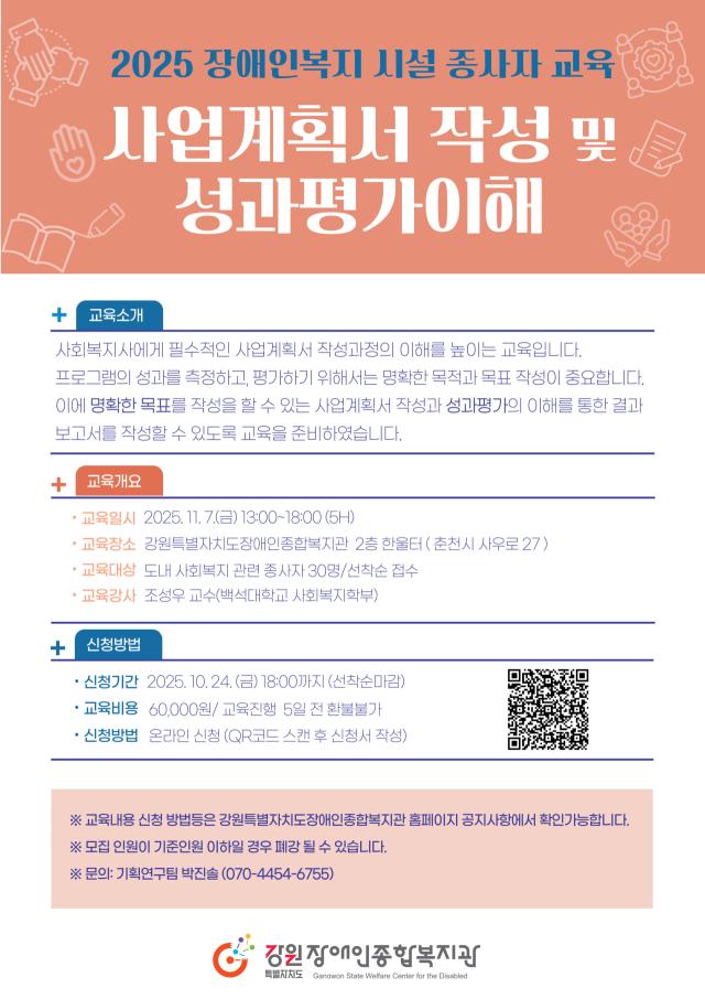 강원특별자치도장애인종합복지관이 다음달 7일 복지관 한울터에서 ‘2025 장애인복지시설 종사자 교육’을 진행한다.