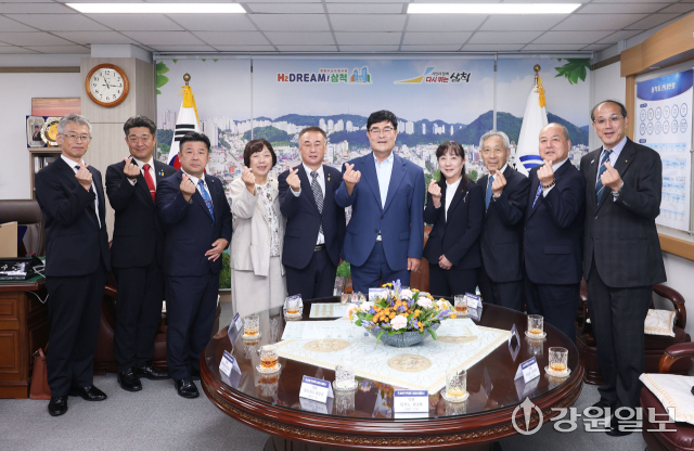 제31회 삼척시민의 날을 축하하기 위해 삼척을 찾은 일본 쿠로베시의회 방문단이 13일 박상수 시장을 예방하고 공동 관심사를 논의했다.