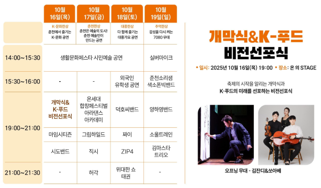 개막식은 오는 16일 오후 7시에 열린다. 이 자리에서 춘천시는 ‘K-푸드 비전선포식’을 진행, 춘천 막국수와 닭갈비 세계화를 알린다. 이와 함께 16일 ‘맛있는녀석들’, 17일 인기 먹방 유튜버 쯔양이 축제장을 찾는다. 17일 밤 가수 허각, 18일 저녁 위대한 태권쇼, 덕호씨밴드 등의 공연도 준비됐다.
