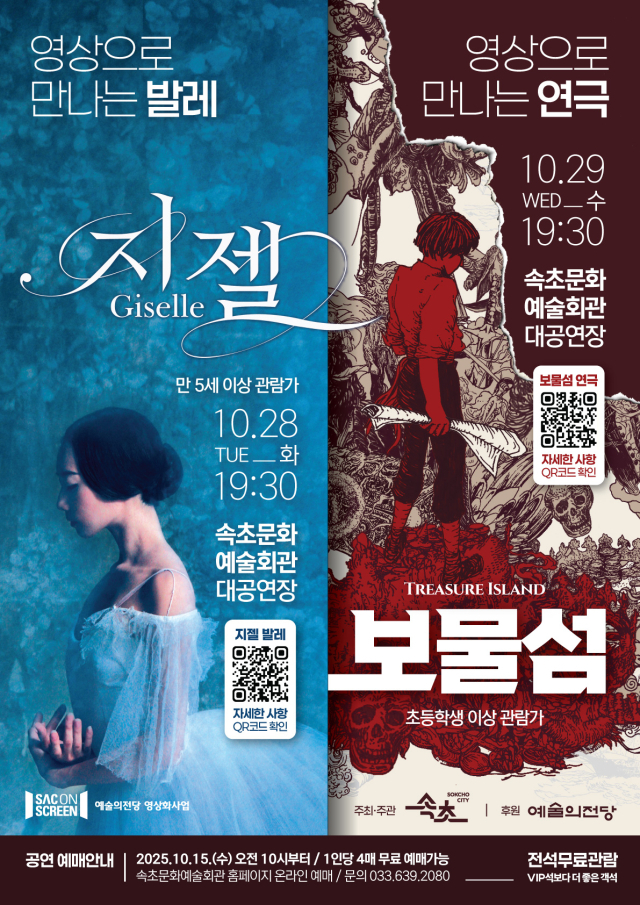 상영작은 발레 ‘지젤’(오는 28일 오후 7시 30분)과 연극 ‘보물섬’(오는 29일 오후 7시 30분)이다.