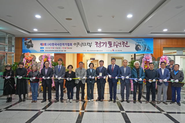 한국사진작가협회 양양지부 정기회원전이 14일 양양문화복지회관 전시실에서 열린 가운데 내외빈들이 전시회 개막을 축하하는 테이프를 자르고 있다.