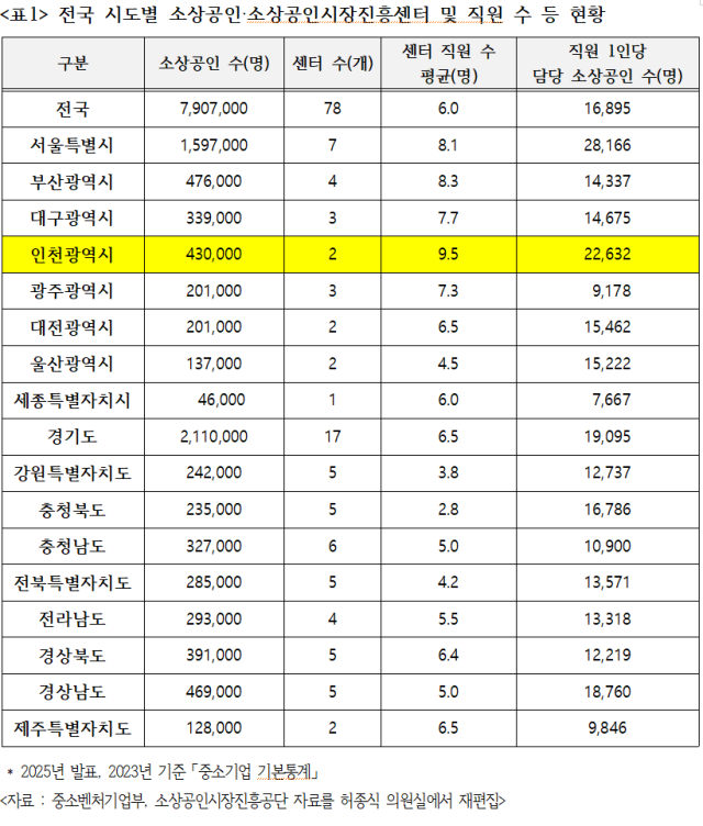더불어민주당 허종식 의원이 소상공인시장진흥공단으로부터 받은 자료에 따르면, 도내 소상공인은 24만2,000명으로 집계됐으며, 도내 소상공인시장진흥센터 직원 1인당 담당하는 소상공인은 1만2,737명이었다. 또 센터 평균 직원수는 3.8명인 것으로 조사됐다.